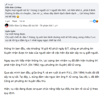 UBND phường An Xuyên (tỉnh Cà Mau) cho biết trên địa bàn xảy ra vụ án mạng khiến một người tử