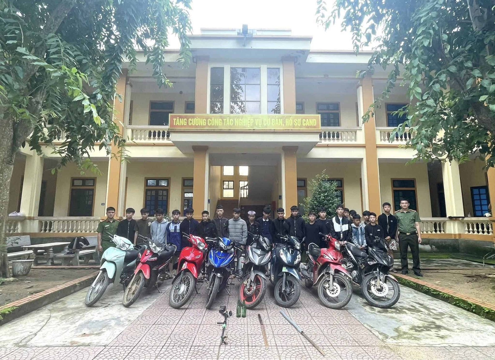 Hai nhóm thanh thiếu niên gồm 22 đối tượng mang theo kiếm, ná cao su, vỏ chai bia chạy xe mô tô với tốc độ cao, lạng lách, đánh võng di chuyển trên tuyến đường của Quốc lộ 16 (địa phận bản Bon, xã Quế Phong) gây mất an ninh trật tự, bức xúc trong quần chúng nhân dân, vừa bị Công an xã Quế Phong, Phòng Cảnh sát hình sự Công an Nghệ An đồng chủ trì, phối hợp Công an xã Tiền Phong bắt giữ.